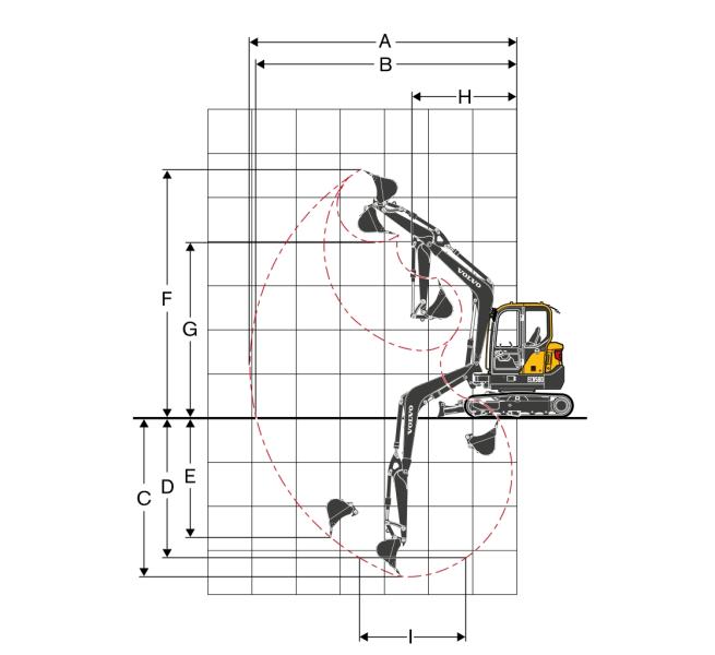 Grävdjupet är upp till 3 940 mm, räckvidden över 6 000 mm, och måtten är cirka 2 000 mm bred, 2 615 mm hög och 5 550–5 580 mm lång. Ljudnivån är 73 dB(A) i hytten och 97 dB(A) utvändigt.