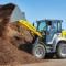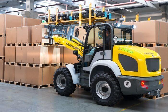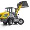 Fyrhjulsstyrd hjullastare med eldrift. Tillbehör: planerskopa och pallgafflar