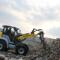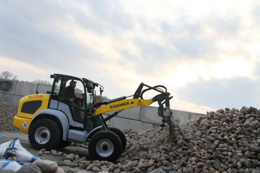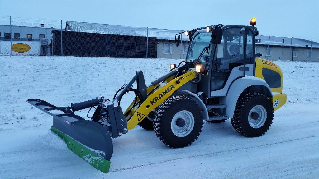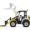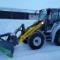 Fyrhjulsstyrd hjullastare. Tillbehör: planerskopa och pallgafflar