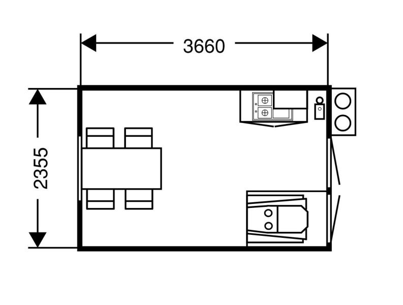 Rastvagn anpassad för fyra personer och utrustad med matrum samt en slamtoalett. Vagnen är avsedd för användning på tillfälliga eller mobila arbetsplatser där ett rast- och toalettutrymme behövs.