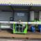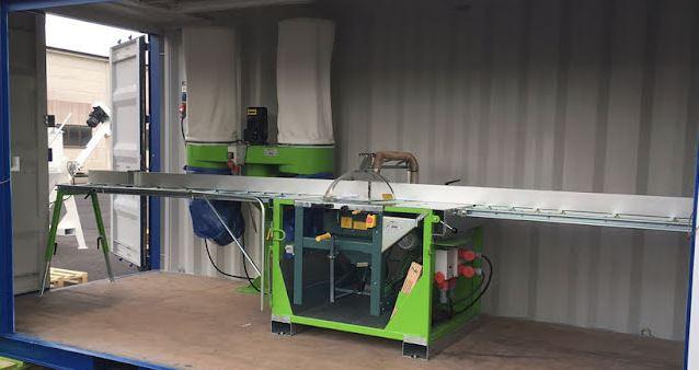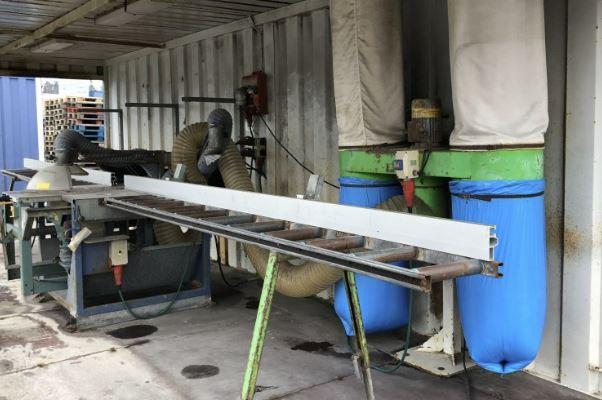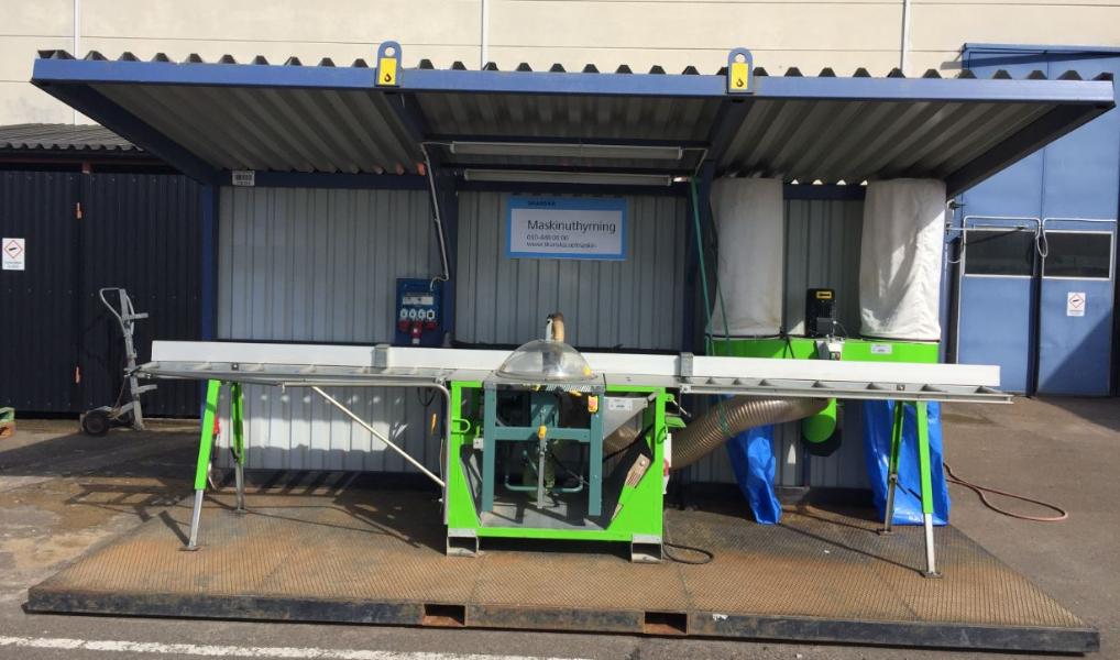 Sågstation med tak och en väggsida och en golvyta på 10 m². Inklusive sågutrustning (Ahlm-sågen, juster- och rullbord) och spånsug. LxBxH: 4800x2060x2650 mm. Vikt: 1800 kg. Inklusive elutrustning och belysning."