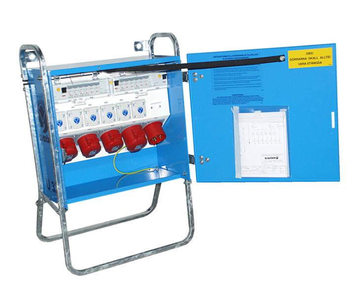 Undercentral med anslutning 4P/32A. Inkommande 5-pol/400V 32A CEE 432-6 1 st Utgående 2-pol/230V Schuko Typ F 6 st Utgående 5-pol/400V 16A CEE 416-6 3 st Utgående 5-pol/400V 32A CEE 432-6 1 st Jordfelsbrytare 0,03A 3 st Kortslutningshållfasthet lcc 6 kA Kapslingsklass IP44