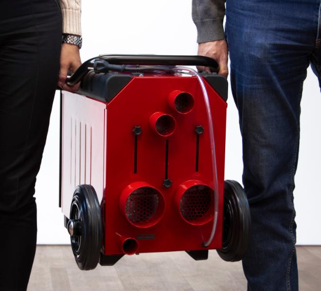 Sorptionsavfuktare med luftkyld kondensor, luftfilter, vattenpump och 5 m slang. Stos för ventilationsslang finns, diameter 100 mm. Ca 12 l/dygn vid 20°C och 60% RF. Rek. lufttemp. 1-25°C. Elanslutning: 1-fas 230V/10A.