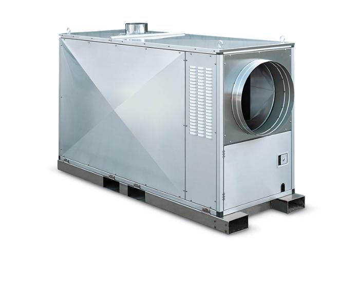 Luftvärmare diesel. Effekt 203 kW. Luftflöde 13900 m³/h. Fläkttryck 620 Pa. Max oljeförbrukning 20,9 kg/h. Utblåsstos dim. 1x500 alternativt 1x400mm. Vikt 235 kg. Anslutning: 3-fas 400V/ 16A. Utrustad med rumstermostat och skorsten.