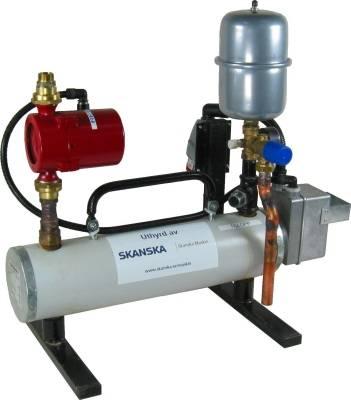 Varmvattenpanna, 6kW, för vattenburen värme. Utrustad med värmepatron, expansionskärl, cirkulationspump och termostat. För tillfällig anslutning till golvvärme eller radiatorer. Kan användas vid t.ex. byte av villapanna. Elanslutning: 3-fas 400V/ 16A.