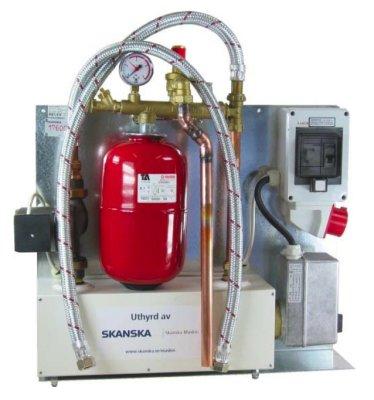 Varmvattenpanna, 9 kW, för vattenburen värme. Med värmepatron, expansionskärl, cirkulationspump och termostat. För tillfällig anslutning till golvvärme eller radiatorer. Kan användas t.ex vid byte av villapanna.