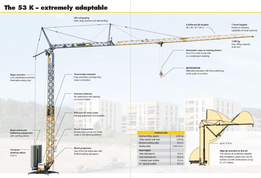 Den snabbt självresande byggkranen Liebherr 53 K är ett imponerande exempel på toppklassig ingenjörskap inom byggbranschen. Även de tyngsta lasterna kan precisionsartat hängas upp och bli fast positionerade. Systemet för kontroll av vindkraftsrörelser håller automatiskt kranarmen i fast position, det behövs alltså inte kompenseras för vindrörelser. Snabba svängningsrörelser kan vanligtvis få laster att svänga men tack vare det integrerade svängningsdämpningssystemet motverkas detta automatiskt. Detta är ett stort steg för att öka säkerheten på arbetsplatsen.