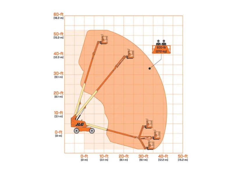 Den har en maximal plattformshöjd på 14 meter och en horisontell räckvidd på 12 meter. Plattformen mäter 2,44 x 0,91 meter, har en kapacitet på 272 kg, och är utrustad med en 1,83 meter lång jib samt en hydraulisk plattformsrotator som kan vridas 180 grader för ökad flexibilitet.