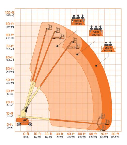 Liften har en plattformshöjd på 26,21 meter och en horisontell räckvidd på 22,78 meter. Plattformen mäter 2,44 x 0,91 meter och har tre kapacitetszoner: upp till 454 kg i den mest begränsade zonen, 340 kg i mellanzonen och 227 kg i hela arbetsområdet (obegränsad zon). Plattformen är även indelad i tre arbetszoner, vilket gör det möjligt för flera personer att arbeta samtidigt med verktyg och material.