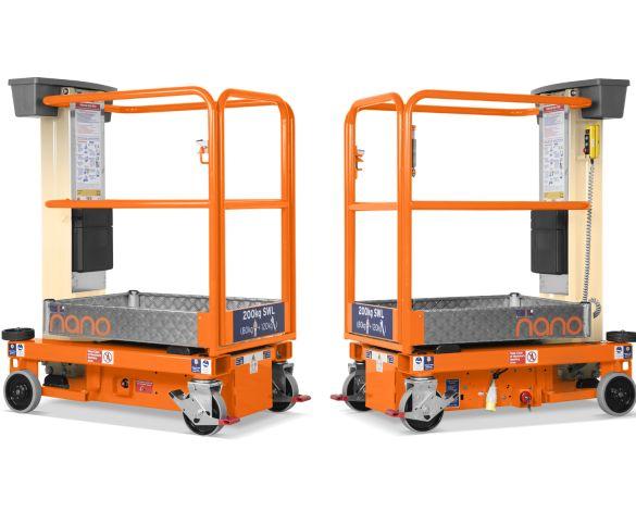 Power Tower Nano 830P är en kompakt pelarlift med manuell förflyttning och batteridriven lyftfunktion. Den har en maximal plattformshöjd på 2,50 meter och en lyftkapacitet på 200 kg. Maskinen är endast 1,19 meter lång, 0,75 meter bred och 1,56 meter hög i stängt läge. En full laddning räcker till cirka 300 lyft, vilket gör den lämplig för underhålls- och installationsarbeten på låg höjd inomhus.
