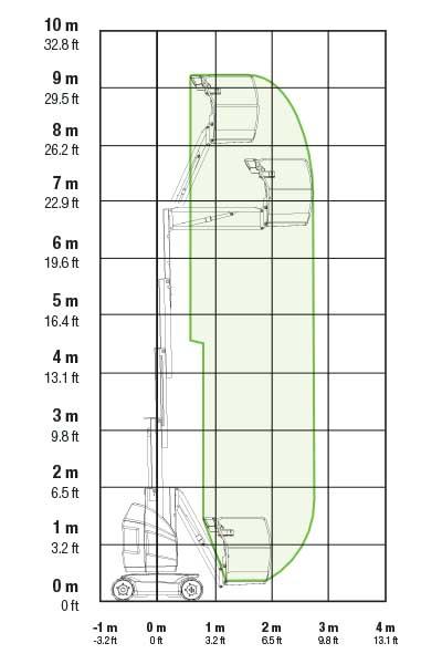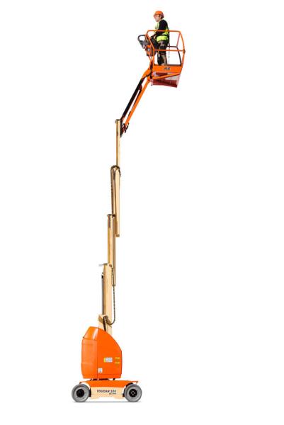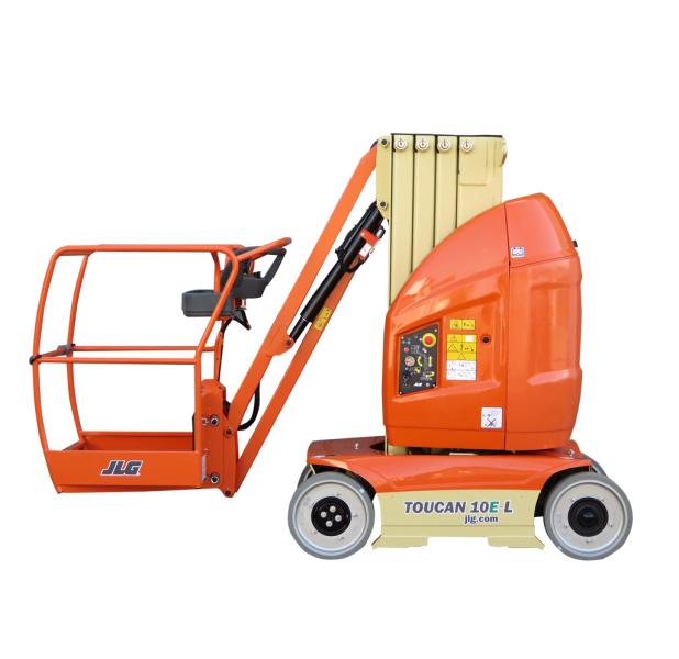 Toucan 10E är en kompakt, eldriven pelarlift med en arbetshöjd på 10,1 meter och en horisontell räckvidd på 3,38 meter. Den är utrustad med ett ledat jibarmsystem med ett rörelseomfång på 126 grader, vilket möjliggör arbete både uppåt och över hinder. Den så kallade up and over-höjden är 6,51 meter. Plattformen mäter 0,90 x 0,70 meter.