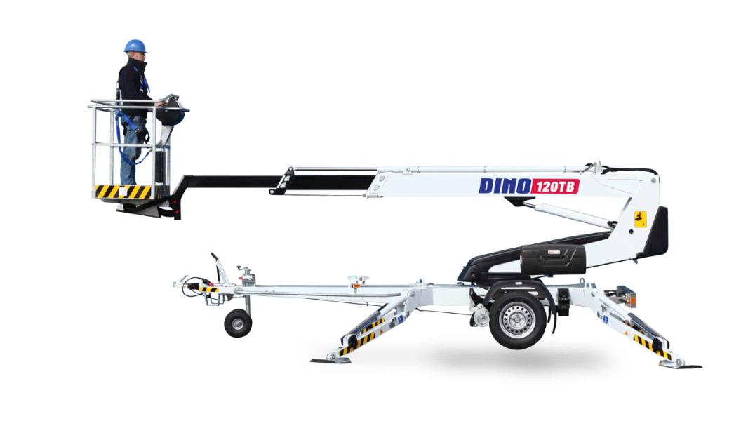 DINO 120 TB är en lätt och stabil släpvagnsmonterad teleskoplift, konstruerad för arbete både inomhus och utomhus. Liften erbjuder en maximal arbetshöjd på 12,0 meter, en plattformshöjd på 10,0 meter samt en horisontell räckvidd på 7,9 meter. Bommen har obegränsad rotation, vilket gör det enkelt att positionera liften från olika riktningar utan att behöva flytta hela enheten.