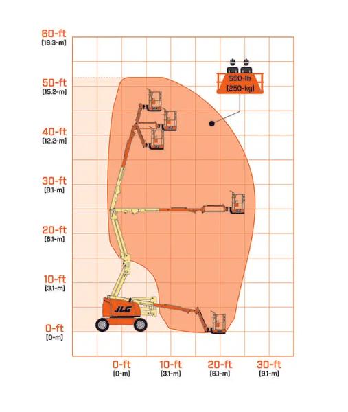 Lyften har en maximal plattformshöjd på 13,72 meter och når 7,62 meter horisontellt. Plattformen mäter 0,76 × 1,83 meter och har en kapacitet på 250 kg. Den är utrustad med 180 graders hydraulisk plattformsvridning för flexibel positionering.