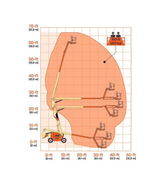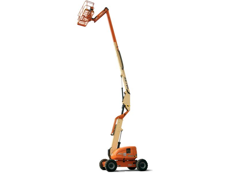 JLG 600 AJ är en vikbomslift för utomhusbruk, konstruerad för arbete på höjd i miljöer med ojämnt underlag. Den har en plattformshöjd på 18.47 meter och en horisontell räckvidd på 12.10 meter, vilket underlättar arbete där hinder eller svåråtkomliga ytor behöver nås. Plattformen mäter 0.91 x 2.44 meter och har en kapacitet på 227 kg. Den kan vridas hydrauliskt 180 grader, vilket ger möjlighet till flexibel positionering.