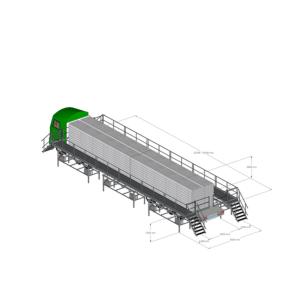 Lossningsplattform med måtten 6,1 x 1,2 x 1,5 meter och en vikt på 799 kg per enhet. Den totala vikten för fyra plattformar är 3196 kg. Plattformen är avsedd för säker och effektiv lossning av material på byggarbetsplatser och andra tillfälliga arbetsområden.
